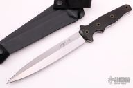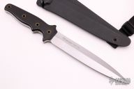 This knife by Tom Maringer features a dagger shaped blade with a sharpened top edge, .248" blade stock and 1.256" blade depth, full tang construction. The handle has green/black linen micarta scales with hollow pins. Comes with a kydex sheath with shoulder rig and a padded zippered case.   Dated 1986 and #349 on the blade. Has some scuffs/scratches visible on the handle and blade otherwise the knife is in good condition.