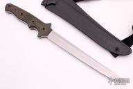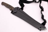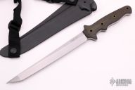 This knife by Tom Maringer features a tanto style blade with polished bead blasted finish .250" blade stock and 1.032" blade depth, full tang construction. The handle has green linen micarta scales with hollow pins. Comes with a kydex sheath with shoulder rig and a padded zippered case. Dated 1984 and #286 on the blade. Prototype 2of2.  Scuffs and scratches are visible on the blade otherwise the knife is in good condition.