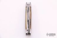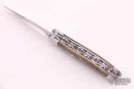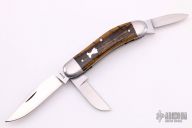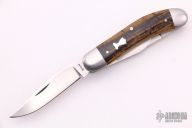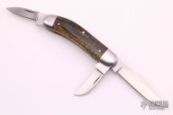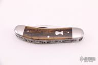 This Sow Belly Stockman by Jim Dunlap features 3 hand rub satin finished blades with nail nicks. The handle has stainless steel bolsters, front and rear, mammoth ivory scales with stainless steel escutcheon, fileworked stainless steel liners and springs. Has half-stops, flush in all positions. Comes with a zippered case. New from maker at the 2021 Blade Show.
