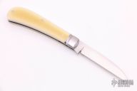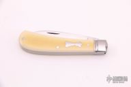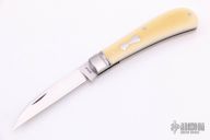 This Trapper by Jim Dunlap features a hand rub satin finished blade with nail nick. The handle has stainless steel fluted bolsters, Westinghouse paper micarta covers with stainless steel escutcheon, stainless steel liners and spring. Has half-stops, flush in all positions. Comes with a zippered case. New from maker at the 2021 Blade Show.