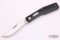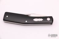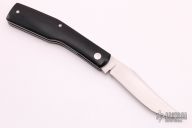 This Bent Gunstock by Jim Dunlap features a hand rub satin finished blade with nail nick. The handle has black paper micarta covers with a stainless steel escutcheon, liners, and spring. Has half-stops, flush in all positions. Comes with a zippered case. New from maker at the 2021 Blade Show.
