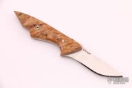 This Custom Small Utility by Alex Hossom features a hand rub satin finished blade with .124" blade stock and .744" blade depth, full tang construction. The handle has maple burl scales with mosaic and brass pins. Comes with a zippered case. New from maker at the 2021 Blade Show.
