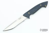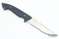 This Prototype by Alex Hossom features a hand rub satin finished blade with sharpened top edge and notched thumbrest, .132" blade stock and 1.161" blade depth, full tang construction. The handle has black/blue paper micarta scales with mosaic pins. Comes with a zippered case. New from maker at the 2021 Blade Show.
