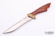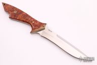 This Fighter by Alex Hossom features a hand rub satin finished blade with sharpened top edge, .121" blade stock and 1.175" blade depth, full tapered tang construction. The handle has burl wood scales with mosaic pins. Comes with a zippered case. New from maker at the 2021 Blade Show.
