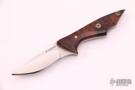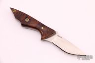 This Custom Small Utility by Alex Hossom features a hand rub satin finished blade with .130" blade stock and .902" blade depth, full tang construction. The handle has ironwood burl scales with mosaic and brass pins. Comes with a zippered case. New from maker at the 2021 Blade Show.