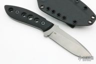 This K9 Model 6 by Krein Knives features a stonewashed blade with notched thumbrest, .186" blade stock and 1.058" blade depth, full tang construction. The handle has black G-10 scales with black hardware. Comes with a kydex sheath with TekLok. New from maker at the 2021 Blade Show.