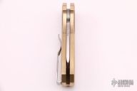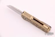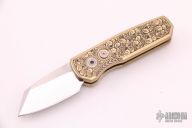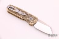 This Runt 5 by Pro-Tech features a mirror polished stonewashed blade with satin finished flats.  The handle features a bronze aluminum frame, a stainless steel tip up pocket clip and a mosaic push button.  The handle has been hand engraved by Bruce Shaw.  New from Maker!