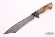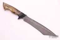 This Fighter by Jerry Hossom features nicely shaped wood scales with black paper micarta bolsters and mosaic pins. Damascus blade with a sharpened top edge and notched thumbrest, .165" blade stock and 1.764" blade depth, full tapered tang construction. Fits nicely in hand. Includes a zippered case. New from maker at the 2021 Blade Show.
