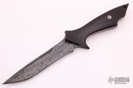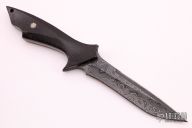 This Fighter by Jerry Hossom features nicely bog oak wood scales with black/red liners and mosaic pins. Damascus blade with a sharpened top edge, .208" blade stock and 1.288" blade depth, full tapered tang construction. Fits nicely in hand. Includes a zippered case. New from maker at the 2021 Blade Show.