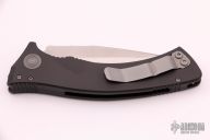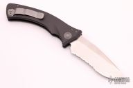 This Amphibian automatic by Microtech Knives has a stonewashed and partially serrated blade with notched thumbramp. The handle is comprised of black aluminum with non-slip inlays, stainless steel clip positioned for tip down carry, and lanyard hole at the pommel. Includes original sheath and papers. Serial number 0585 and dated 01/2002. Excellent condition.