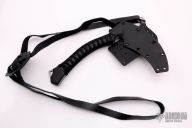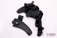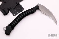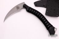 The ReaperTAC from Bastinelli Creations is one cool tool. It's a tactical version of a scythe, an old school tool for reaping crops that has long since been replaced by heavy machinery throughout much of the world. This variation is like a tomahawk in its tactical usage however it incorporates none of its utility functionality. The ReaperTAC measures 9.45" overall with a 6.7" Bohler N690Co stainless steel blade. The recurved shape allows this blade to rip and tear like an elongated talon and the design tapers toward the tip to allow ample penetration power from such a unique tool. The ergonomic handle is made from contoured black G10 allowing a sure grip at the base or top of the handle. The ReaperTAC includes a leather belt sheath and was proudly manufactured by Fox Knives in Italy and a shoulder holster. New from maker.
