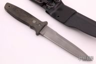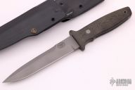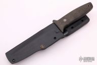 This Model 30 Battle Guard by Bob Terzuola features a bead blasted spear point blade with a sharpened top edge and notched thumbrest, .197" blade stock and 1.097" blade depth, hidden tang construction. The handle is black linen micarta with non-slip grip on the bottom of the handle and a lanyard hole. Comes with kydex sheath and a zippered case. Excellent condition.