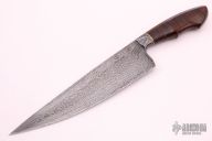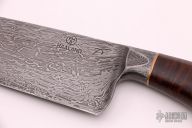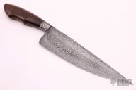 This Chef's Knife was forged by Master Smith Jason Knight and the handle and finish was shaped by Curtis Haaland, Bladesmith at Knight Forge Studio in Kingsport, Tennessee. It features a Damascus blade made up of 80CrV2 and 15N20, it has and integral bolster and a nice distal taper with .160" blade stock in front of the bolster, 2.319" blade depth, hidden tang construction. The handle has a bronze spacer with a Ring Gidgee wood grip. Comes with a zippered case and COA dated March 2021. New condition.