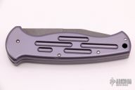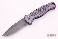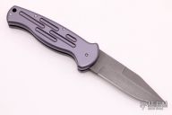 This AFO Side Opening Auto has a bead blasted stainless steel clip point blade. Handle is purple aluminum with milled fullers and lanyard hole. Excellent condition.