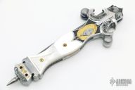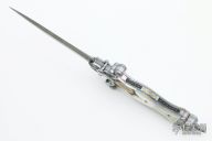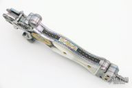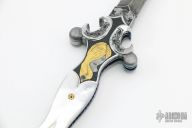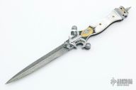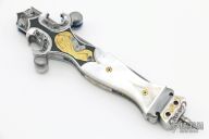 This Linerlock Auto by Shaun and Sharla Hansen features a Damascus blade with false top edge. The handle has engraved stainless steel bolsters with gold inlays, stainless steel rocker bar, carved mother-of-pearl scales, fileworked screws, stainless steel backspacer and rear bolsters with gold engraving, fileworked and anodized titanium liners. The lady engraved on the bolsters is rumored to be Sharla Hansen. The inside of the backspacer is engraved with "S.S.H." Comes with a zippered case. Has a strong action, nice lockup and blade seating. Has a small scratch on the rocker bar, otherwise excellent condition.