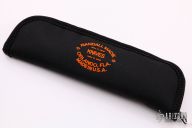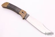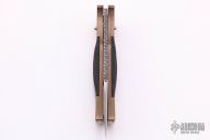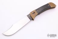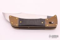 This early folding bowie by Elliot Williamson (Ferrum Forge) features a hand rub satin finished clip point blade with textured flats and blade spine, false top edge. The handle has orange peel finished and anodized titanium bolsters and liners, carbon fiber scales, gold plated screws, has an axis-lock style lock mechanism. Comes with a zippered case. Has a little vertical play, otherwise excellent condition. This is an early piece from Elliot Williamson.