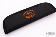 This knife by John Barker features a hand rub satin finished blade with false top edge and notched thumbrest, .204" blade stock and 1.440" blade depth, full tapered tang construction. The handle has black linen micarta scales. Comes with a kydex sheath. Has a few light scratches, otherwise excellent condition. Comes with a zippered case.