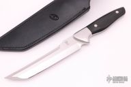 This Hokkaido fixed blade by John Barker features a hand rub satin finished blade with false top edge and notched thumbrest, mirror polished tanto edge, .175" blade stock and 1.358" blade depth, full tapered tang construction. The handle has satin finished stainless steel bolsters with a mild dovetail, black linen micarta scales. Comes with a hand tooled black leather sheath by Paul Long. Has a few light scratches, otherwise excellent condition.