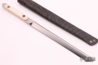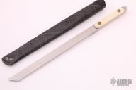 This Large Tanto by Phill Hartsfield has a chisel ground tanto blade with nice hamon, .251" blade stock and .750" blade depth, hidden tang construction. The handle has walrus ivory scales. Includes the original paper lined, hide covered metal sheath. Excellent Condition. Comes with a zippered case.