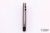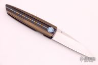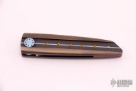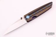 This liner lock folder by Christian Wimpff features a hand rub satin finished wharncliffe blade with single anodized titanium thumbstud. The handle has milled titanium scales with gold stud inserts, anodized titanium pivot, liners and backspacer. Nice detent, lockup and blade seating. Comes with a Bill's velcro case. Excellent condition.