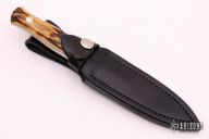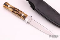 This Dagger by John Young features a mirror finished double-edged blade with a hollow ground b-side of the blade, .199" blade stock and .796" blade depth, full tapered tang construction. The handle has mirror polished stainless steel guard, stag scales with red liners. Comes with a black leather sheath and zippered case. Excellent condition. "1 of 10" on the tang.