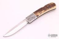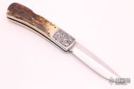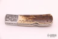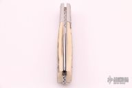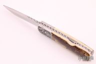 This hidden button release auto from A.A. Sanders features a mirror polished drop point blade with file worked spine. The handle is comprised of dovetailed and engraved stainless steel bolsters and mammoth ivory scales, over stainless steel liners and fileworked backspacer. Strong spring action, nice blade seating. Has some light scratches, otherwise excellent condition. Comes with a zippered case.