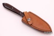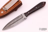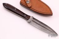 This knife by Jody Muller features a Damascus double-edged blade with fullers, .157" blade stock and 1.031" blade depth, full tang construction with desert ironwood scales. Comes with a brown leather sheath with belt clip. Excellent condition.