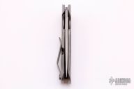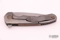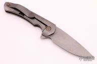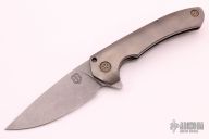 This Intercept from John Gray Knives features a drop point tumble finished blade with a flipper. The handle has an orange peel finished and anodized titanium frame, and tip up clip, anodized titanium backspacer. Rides on bearings. Nice detent and lockup. Excellent condition. Comes with a zippered case.