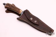 This Bowie by Jerry Rados features a Damascus blade with a nearly sharpened top edge and visible hamon, .234" blade stock and 1.768" blade depth, hidden tang construction. The handle has a blued steel guard and butt with a nice stag grip. Comes with a brown leather sheath and zippered case. This knife is a full takedown design. Numbered 9. Excellent condition.