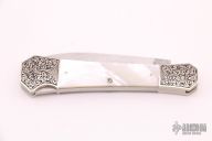 This Coffin Lockback is a collaboration between Mel Pardue and Bill Bagwell. It features a drop point cable Damascus blade forged by Bill Bagwell. The handle is comprised of engraved nickel silver bolsters, front and rear, with mother-of-pearl scales over nickel silver liners and stainless steel backspacer, has mosaic and nickel silver pins. Marked "Pardue - Bagwell 001" on blade. Excellent condition. Comes with cloth pouch.