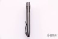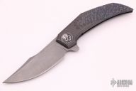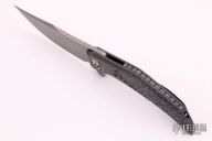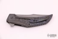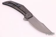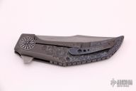 This Xerxes by Gudy Van Poppel is a Tashi Bharucha design, it features a clip point blade with false top edge and a flipper. The handle has a hand carved titanium frame done by Gudy, it is anodized, has a matching tip up clip, fileworked and tapered titanium backspacer, hand carved 440C pivot done by Gudy, lanyard at the butt. Nice detent, lockup and blade seating, rides on ceramic bearings and has a ceramic pivot. Comes with a zippered case. Excellent condition. Dated 2019 inside frame.