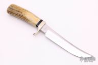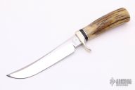This Model D by GW Stone features a mirror polished blade with .233" blade stock and 1.091" blade depth, hidden tang construction. The handle has a nickel silver guard and stag grip with nickel silver butt plate and black/nickel silver spacers. Comes with a zippered case. Excellent condition.