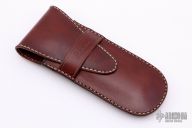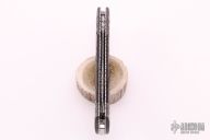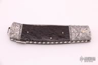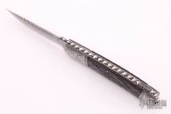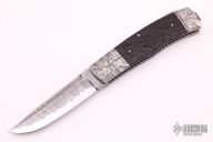 This Sole Authorship Lockback folder features a San Mai Damascus blade with three gold pins, false top edge, and fileworked spine. The handle has fluted "Snowflake" Damascus double bolsters, nicely figured Blackwood scales, fileworked stainless steel liners and backspacer with checkered lock release and lanyard bail, gold pins. Comes with a leather case. Nice lockup and blade seating. Very smooth. Excellent condition.