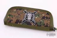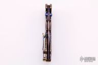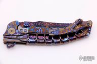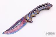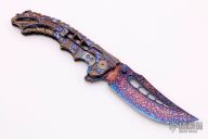 This stunning folder from South African maker Andre de Villiers is a great example of art and function. The Scavenger's trailing point blade is Bertie Rietveld's Dragonskin Damascus with dual anodized titanium thumbstuds, notched thumbrest, and flipper. The handle has a skeletonized integral mokuti frame with matching tip up clip. The action is smooth, lockup is secure, the feel is light and agile. Condition is excellent. Comes with zippered case.