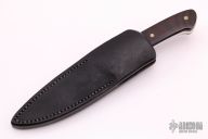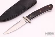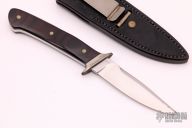This Boot Knife by RJ Kessnick features a hand rub satin finished blade with nearly sharpened top edge, .176" blade stock and .829" blade depth, full tang construction. The handle has a nickel silver guard, black/maroon linen micarta scales with black liners. Comes with a black leather sheath with metal clip. Has some patina on the nickel silver, has some light scratches, otherwise good condition.
