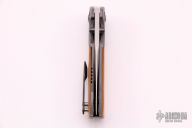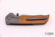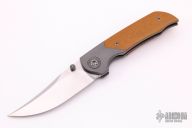 This Mini Wyvern Bolsterlock from Walter Randolph features a hand rub satin finished blade with dual zirconium thumbstuds. The handle has a bead blasted titanium bolsters with integral liners, Vintage crosscut Westinghouse linen micarta scales, zirconium pivot collars, floating backspacer and tip up clip. Nice detent, lockup and blade seating. Rides on ceramic bearings and detent. Comes with original case, drawstring bag and COA dated 6-8-21. New from maker. This is the second bolsterlock that Walter has made up to now!