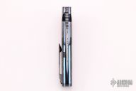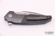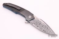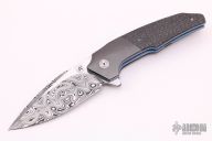 This Tashi Bharucha designed flipper by Andre Thorburn and Andre van Heerden features a spear point Damasteel blade with a false top edge, notched thumbrest and flipper. The handle has zirconium bolsters, silver lightning strike carbon fiber scales over anodized titanium liners, carbon fiber backspacer and zirconium tip up clip. Includes original case and COA. Nice detent, lock up and blade seating. Excellent Condition.