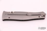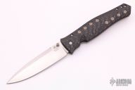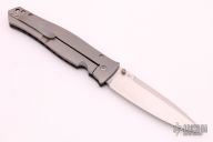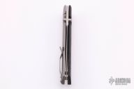 This Dr. Death by Tom Mayo features a hand rubbed satin finish spear point Stellite 6K blade with false top edge and dual mosaic pin thumbstuds. The handle has a carbon fiber front scale with mosaic pin inlays, bead blasted titanium frame with matching tip up clip and titanium standoffs. Nice detent, lockup and blade seating. Comes with a velcro case. Excellent condition.