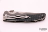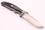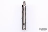 This Avenger by RJ Martin features tumble finished blade with notched thumbrest and a thumbdisc. The handle has 2 deep finger grooves that provide positive indexing in both forward and reverse grips. Deep traction grooves on blade spine anchor the thumb, but don't hang up on your pocket during deployment. CNC Textured black/green G-10 scales for maximum grip-ability. Ambidextrous textured Titanium thumb stud for slip-free blade opening. The .090 thick bead blasted titanium frame is rigidized by 4 precision Ti standoffs and a massive 3/16 diameter Hardened Stainless stop pin. Has a couple light scuffs, otherwise excellent condition. Comes in a zippered case. Nice detent, lockup and blade seating.