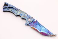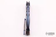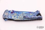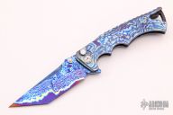 This Tighe Fighter from Brian Tighe features a San Mai blade with Timascus and Beta C Ti Core, compound ground tanto blade with swedge, dual thumb studs, notched thumbrest and flipper. The handle has timascus scales, carbon fiber backspacer, tip up timascus clip with ceramic ball inlay. Comes with nylon zippered case and COA. Excellent condition. Rides on bearings. Nice lockup, action and blade seating.