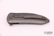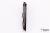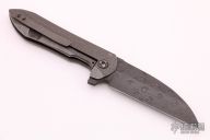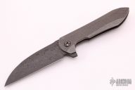 This Druid by Peter Rassenti features a Chad Nichols Raindrop Damascus blade with swedge and flipper. The handle is comprised of a textured and anodized titanium integral flame with matching tip up clip. Rides on bearings, nice detent, lockup and blade seating. Excellent condition. Includes original box.