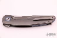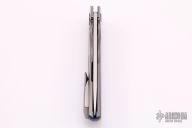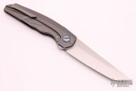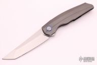 This Russian Flippin' Tanto is a collaboration between Shirogorov Knives and Brad Southard, it features a tumble finished tanto blade with notched flipper. Has roller bearing system. The handle has a milled titanium handle with anodized titanium pivot colars and backspacer, tip up titanium clip, lanyard pin at the butt. Nice detent, lockup and blade seating. Comes with original box and papers. COA #129/200. Excellent Condition.