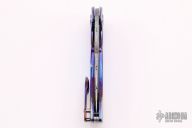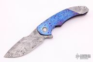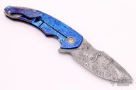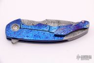 This Full Dress Deimos flipper by Walter Randolph features a Damasteel blade with notched flipper. The handle has a mokuti frame with Damasteel pivot collars and inlaid rear bolsters, two-piece floating Damasteel backspacer, tip up mokuti clip. Rides on bearings, nice detent, lockup and blade seating. Comes with a velcro case. Excellent condition.