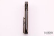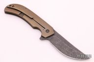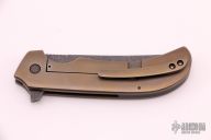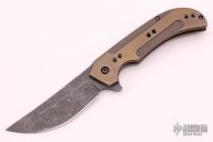 This Serpents Line flipper by David Mosier and Sean Kendrick features an upswept tumbled blade with notched thumbrest and flipper. The handle has a milled, orange peel finished and bronzed titanium frame with matching tip up clip and a black G-10 backspacer. Nice smooth action, detent, lockup and blade seating. Comes with nylon zippered case. Excellent condition.
