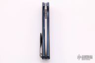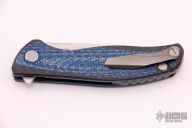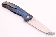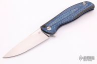 This Custom Division F3 Flipper from Shirogorov Knives has a tumble finished flat ground drop point blade with notched flipper. Handle has black/blue carbon fiber scales, anodized titanium liners, bead blasted titanium tip up clip and backspacer. Recessed lanyard bail. Dead center blade seating, excellent detent and lockup. Original box. Excellent condition. Roller Bearing System.