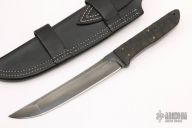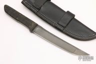 This One Off Kwaiken by Master Smith Jason Knife features a blued multi-ground tanto blade with forge finished flats, .257" blade stock and 1.301" blade depth, full tang construction. The handle has black linen micarta scales with brass pins. Comes with black leather sheath. Excellent condition. Comes with a zippered case.