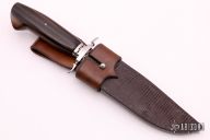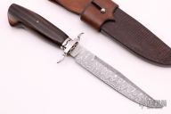 This Gentleman's Bowie by Todd Kopp features a Damascus blade with false top edge, .129" blade stock and 1.078" blade depth, hidden tang construction. The handle has a nicely shaped double stainless steel guard, fileworked nickel silver spacers, wood grip with mosaic pin. Comes with a brown leather sheath with lizard skin overlay. Excellent condition. This knife was featured on page 166 of "KNIVES 2011" and comes with a plaque.