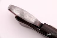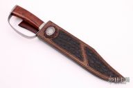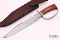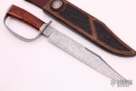 This D-Guard Bowie by Master Smith Kevin Harvey (this knife has his Master Smith stamp) features a Damascus blade with a sharpened top edge, .259" blade stock and 1.570" blade depth, hidden tang construction. The handle has a Damascus D-Guard, engraved nickel silver collar that says "In God We Trust", cocobolo grip, Damascus butt cap. Excellent condition. Comes with a brown leather sheath with black ostrich skin inlays and nickel silver engraved overlay. Excellent condition. Comes with COA. This knife was voted the best Historical Knife at the 2008 Southern Africa Knifemaker's Guild Show. Comes with plaque.