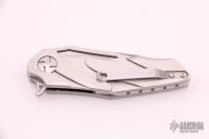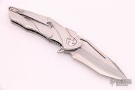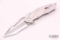This Kisaragi by Dew Hara features a 15 layer VG-10 core San Mai Damascus blade with notched thumbrest and flipper. The handle has satin finished 316 stainless steel scales and backspacer, bronzed 420 stainless steel liners and tip up clip. Nice detent, blade seating and lock up. Rides on bearings. Includes original box and COA. Excellent condition. COA dated 06/2019 and S/N 043.