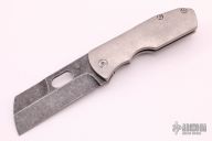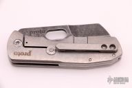 This Karook Prototype #3 by Kingdom Armory features a dark tumble finished blade with thumbhole. The handle has a tumbled titanium frame with matching backspacer and tip up clip. Nice detent, lockup and blade seating. Excellent condition.